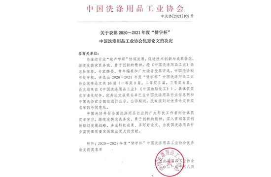 关于表扬2020-2021年度“尊龙时凯人生就是搏官网z6mg杯”中国洗涤用品工业协会优异论文的决议...