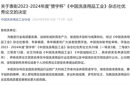 关于表扬2023-2024年度“尊龙时凯人生就是搏官网z6mg杯”《中国洗涤用品工业》杂志社优异论文的决议...